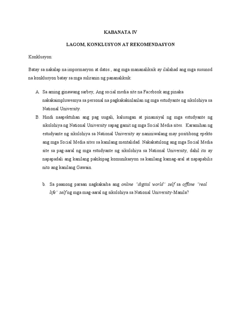 Handa ng isulat ang Resulta at Diskusyon sa bahaging ito kasunod ang Lagom Konklusyon at Rekomendasyon ng pananaliksik. Mga Mag-aaral Ang impormasyon ay magbibigay ng ideya sa mga mag-aaral ukol sa kanilang mga limitasyon at kung paano nila ito masusulusyunan. Saklaw at Limitasyon ng Pananaliksik.