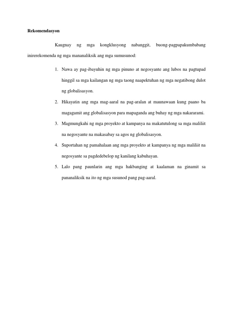 Ang rekomendasyon ng pananaliksik ay binubuo batay sa mga natukoy na konklusyon. Ililikom ang mga instrumento at ihahambing ang mga sagot ng bawat kalahok at bigyan ng kabuuan at konklusyon. Rekomendasyon Ito ang mga sumsusunod ng mga nabuong rekomendasyon ng mga mananaliksik base sa kinalabasan ng pag-aaral na kanilang nagawa.